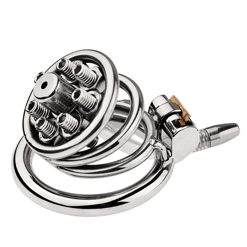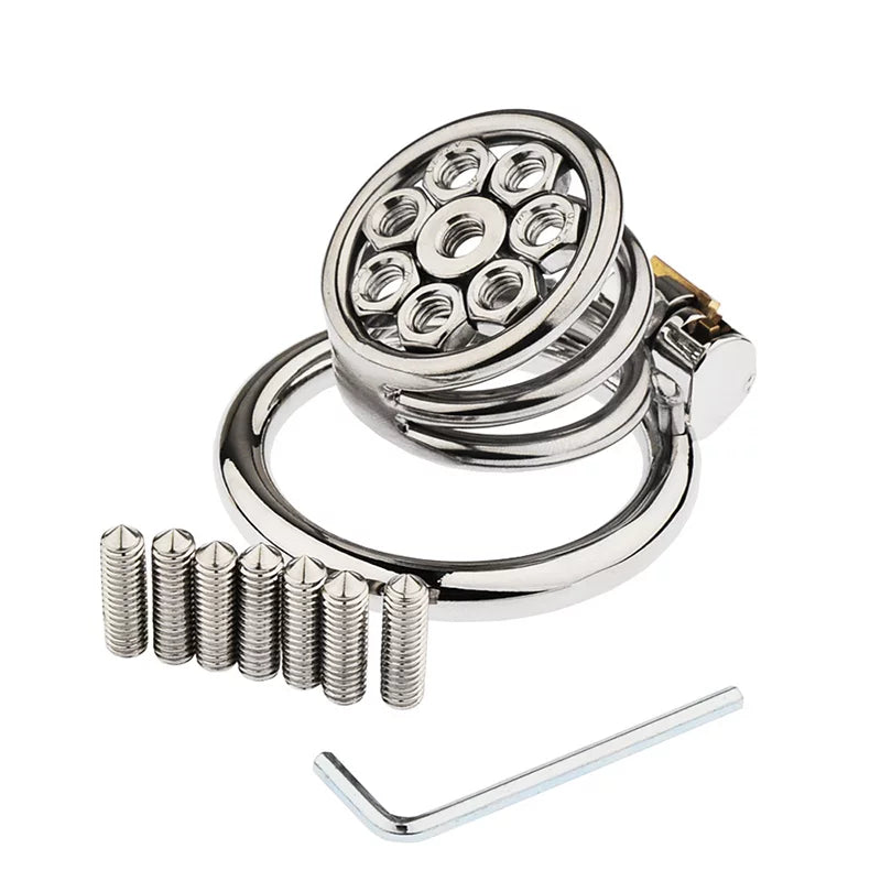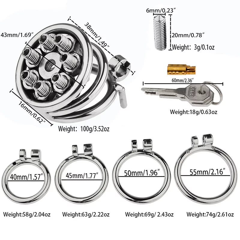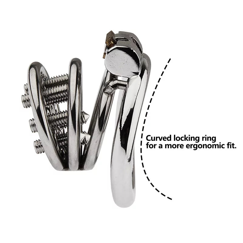 Equipado con 8 puntas metálicas afiladas y roscadas en la parte delantera de la jaula, este dispositivo ofrece una estimulación física intensa y una experiencia de nivel de castigo para jugadores serios de castidad y BDSM.