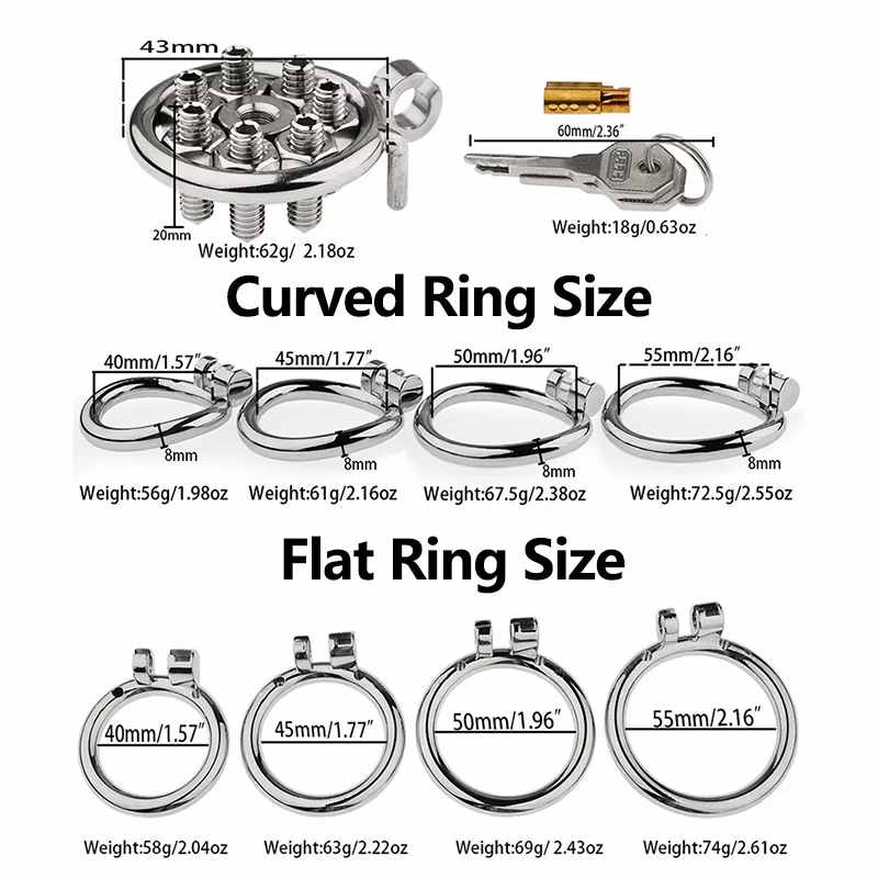 Cada juego incluye una jaula, un anillo, 4 tornillos, 2 llaves, un candado y un catéter de silicona opcional. Peso total aproximado: 200 g.