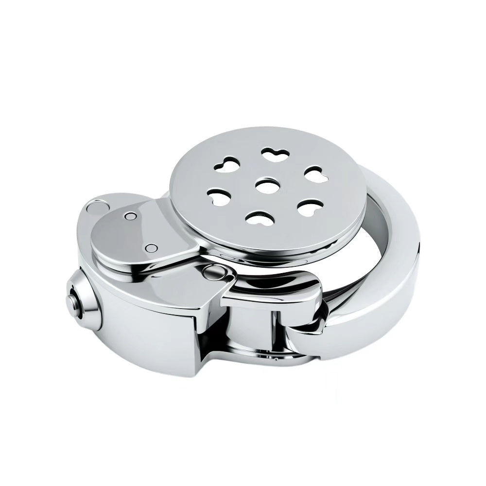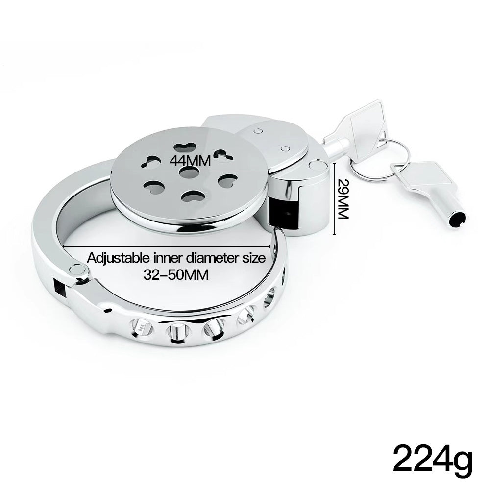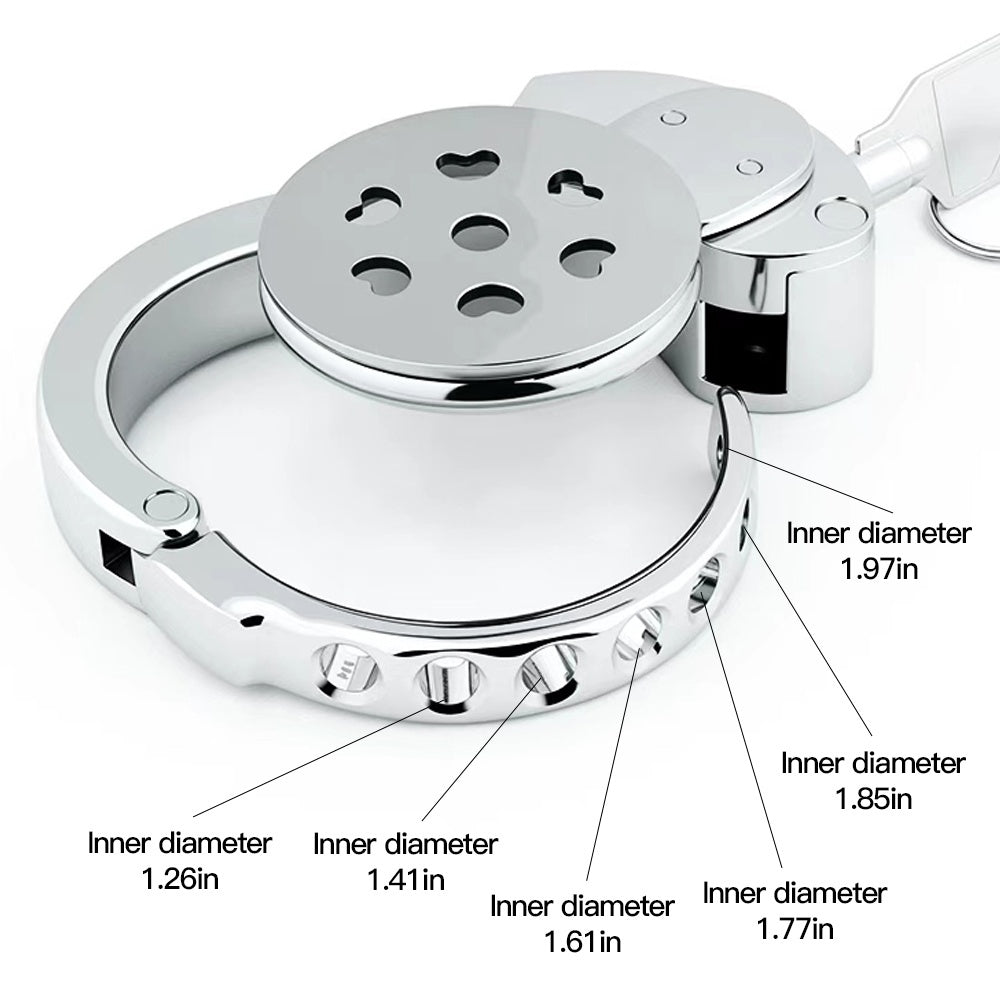 Fall in love with perfect control. This adjustable flat metal chastity cage features a polished heart-pattern design and a customizable fit with an inner ring size ranging from 32mm to 50mm. Made from durable stainless steel, it’s built for secure long-term wear with a low-profile shape (44mm x 29mm) for everyday discretion. A unique fusion of romance and restraint—designed for those who lock with love.
