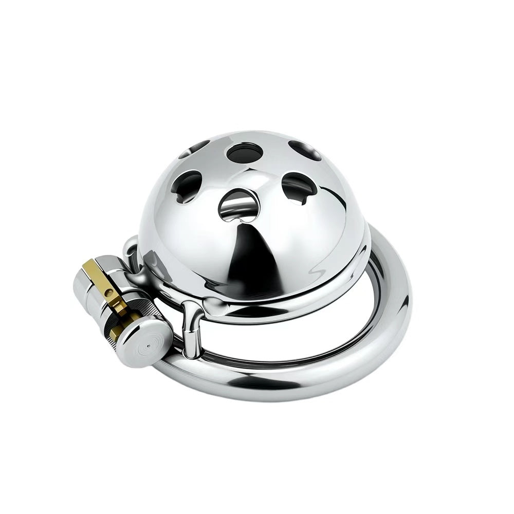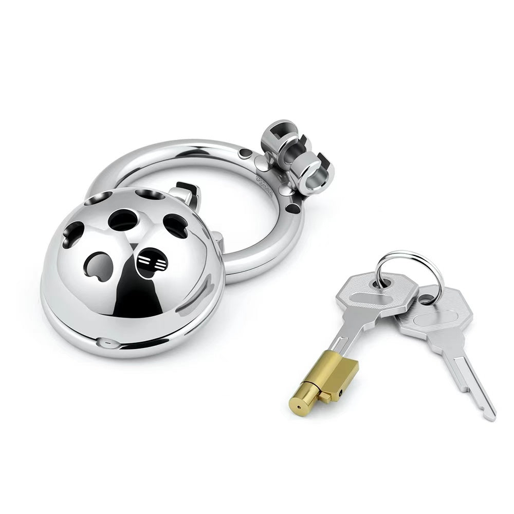 This short dome-shaped metal chastity cage features a charming heart pattern engraved across its smooth surface—designed for those who crave both control and cuteness. Compact, secure, and ideal for discreet wear, it’s perfect for romantic play, power exchange, or simply making a bold statement. Available in multiple ring sizes for a snug, locked-in fit.