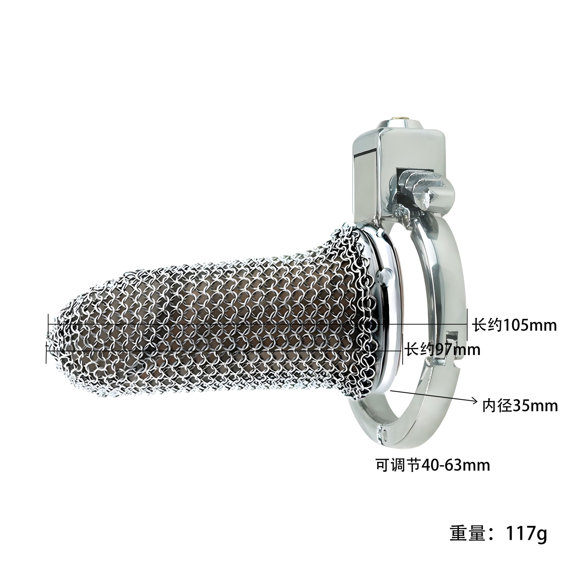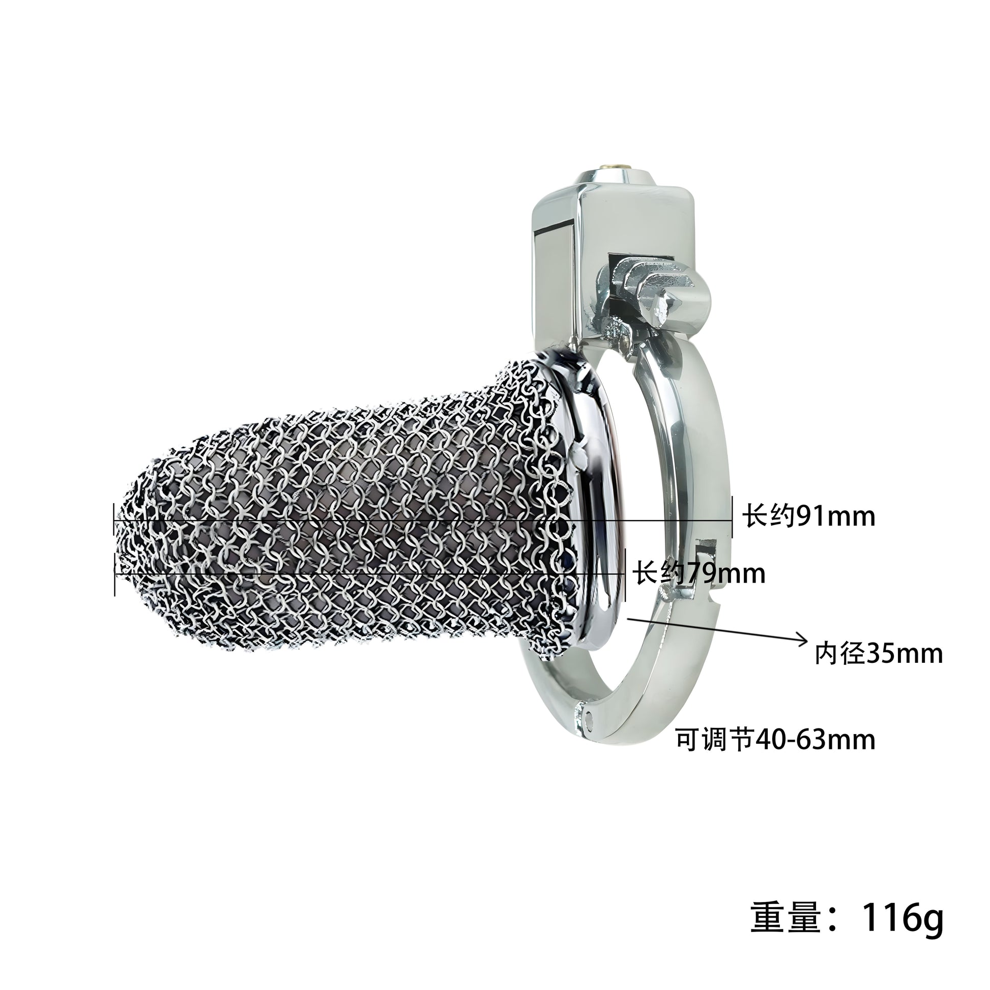 Lightweight Full-Metal Chastity Cage – Chainmail Front, Alloy Ring, Built-in Lock,40–63mm Ring
