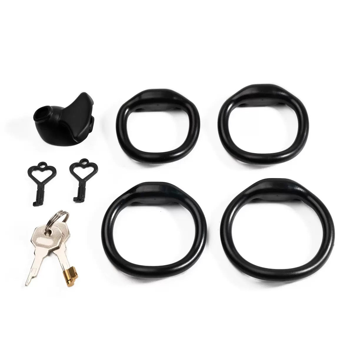 Feature Details Material High-Quality, Lightweight Resin Cage Length 31.88mm (Ultra-Compact) Inner Diameter 23.79mm Ring Sizes 42mm, 45mm, 48mm, 52mm (All included) Total Weight 60g Color Options Classic Stealth Black / Playful Sissy Pink -