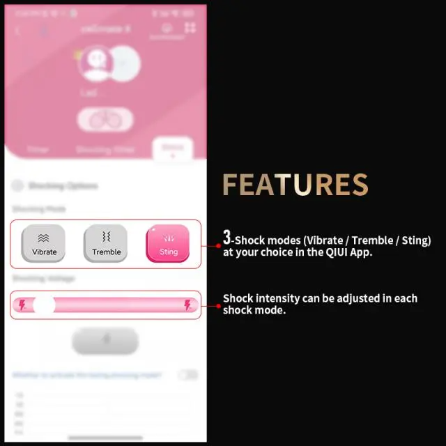 You can choose Vibrate, Tremble, or Sting 3 mode in the QIUI App. Shock intensity can be adjusted in each shock mode.